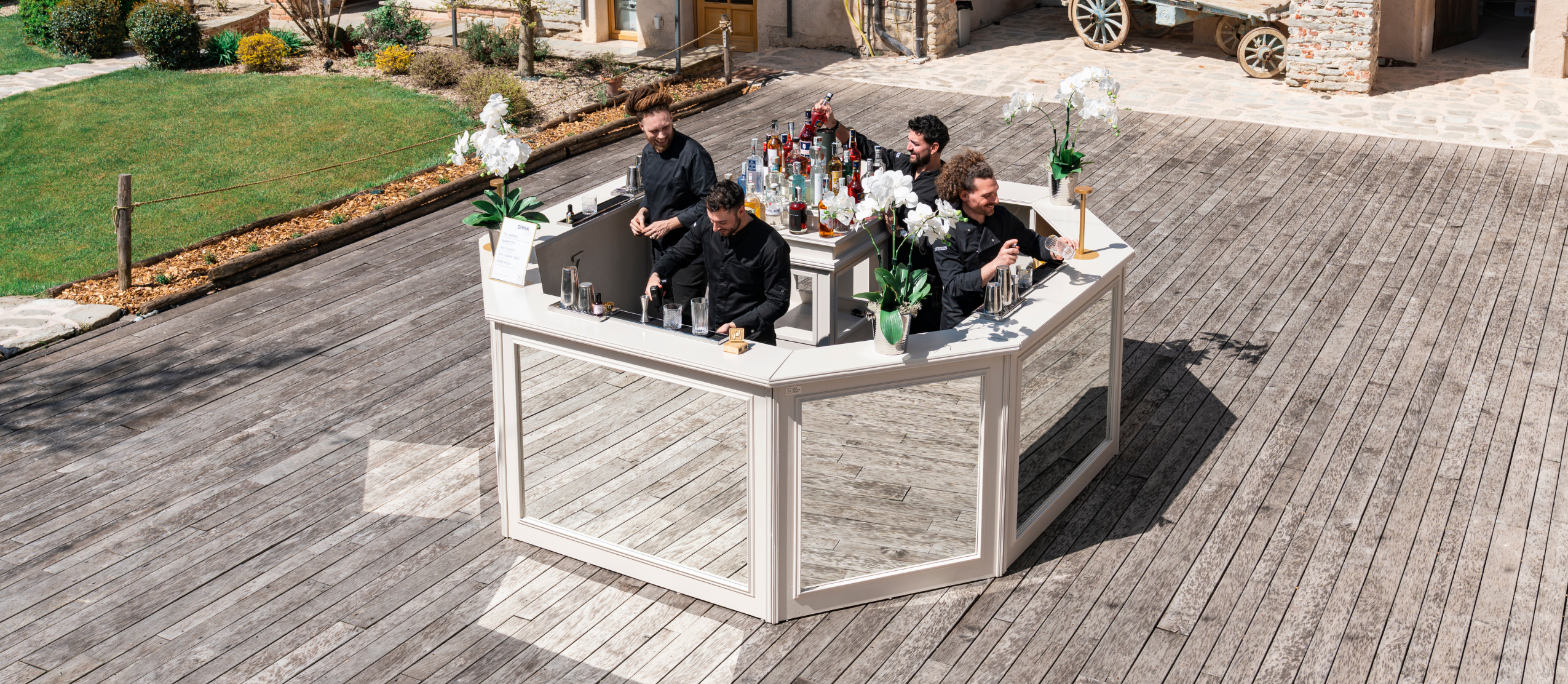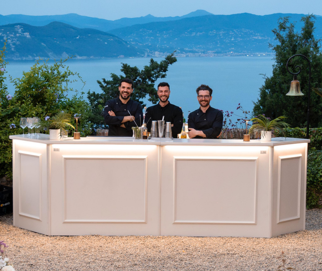 Il nostro bancone artigianale più scenografico: 4 postazioni, bottigliera protagonista e un look elegante per eventi a 360°.